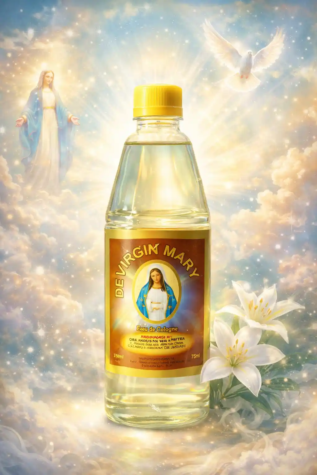 Encased in a golden-haloed bottle adorned with the image of the Blessed Virgin, this cologne channels the essence of compassion, protection, and divine femininity. The fragrance opens with a whisper of holy freshness, settles into a heart of tranquil floral devotion, and lingers with a base of spiritual warmth that comforts and uplifts.